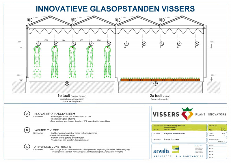 Vissers Plant Innovators heeft met ondersteuning (Steun uit het ELFPO "Europese Landbouwfonds voor Plattelandsontwikkeling: Europa investeert in zijn Platteland http://ec.europa.eu/agriculture/index.nl.htm) van de Europese Unie en van de Provincie Limburg een belangrijke stap gezet in de ontwikkeling van een extra smalle kweekbak in combinatie met een vernieuwd hangsysteem. Door het nieuwe ontwerp kan het licht dieper in het gewas doordringen. Daardoor is eventueel een dubbele teelt mogelijk. Het innovatieve systeem is geïnstalleerd in de recent nieuwgebouwde kas. Bij de nieuwbouw van deze kas, speciaal gebouwd voor het geconditioneerd vermeerderen van aardbeiplanten, is zeer fijnmazig insectengaas bij de beluchtingsramen geïnstalleerd. Hierdoor wordt mede het gebruik van natuurlijke gewasbeschermingsmiddelen verder teruggedrongen. Daarnaast wordt het drainwater uit de teeltbakken, na zuivering hergebruikt. Kortom een totaal systeem, beter voor mens en milieu.
